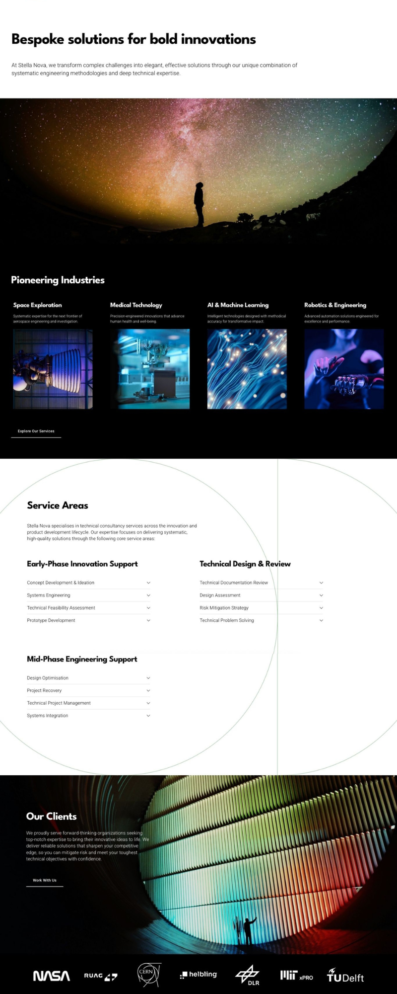 Web pages include: Home, Services, About, Team, and Projects — a blog featuring new research and case studies to showcase Stella Nova’s expertise in Space, MedTech, AI & Machine Learning, and Robotics & Engineering.