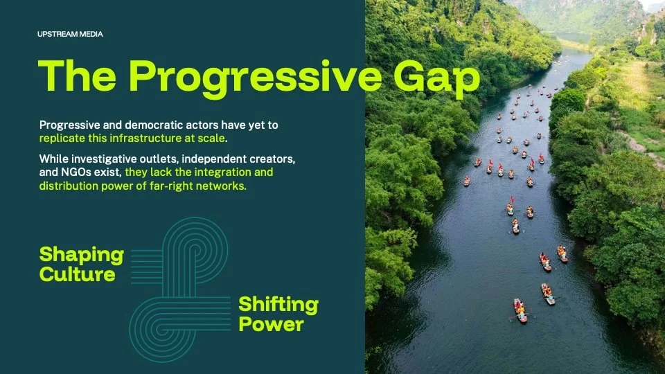 Founded by Alessandra Orofino (Obama Fellow), Upstream Media is a dual-entity initiative—part business, part non-profit—that acquires and influences cultural and media assets to counter authoritarian dominance and build long-term democratic, climate, and cultural resilience in Brazil and around the world. The far right has already seized culture. Upstream Media is building the infrastructure to win it back— by shifting values and mindscapes at scale.
